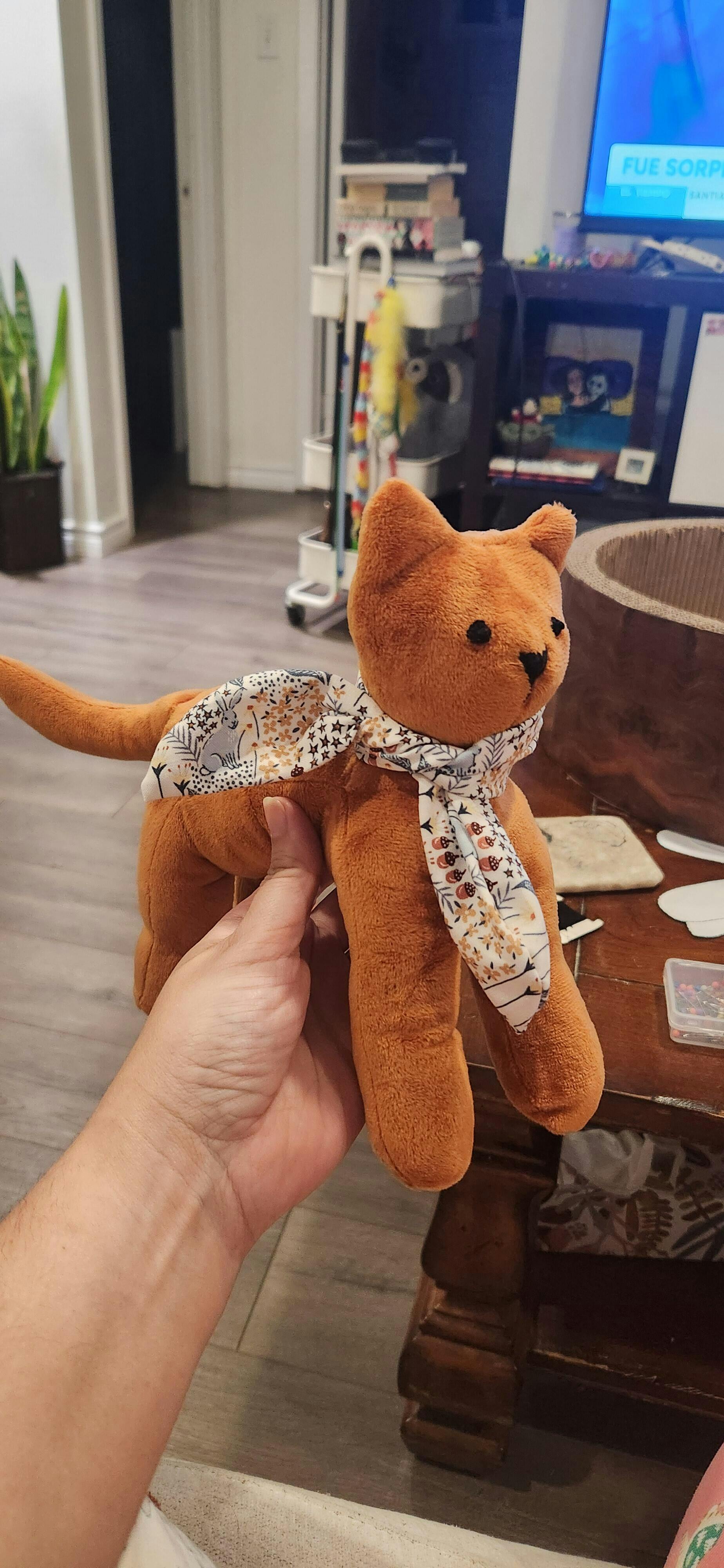 I think everyone loves cats, why not make a little one yourself? This handmade cat toy is made from minky fabric, soft, cute, and comes with a scarf for extra charm. It’s perfect as a gift for a child, a present for a cat lover, or a cute decoration for a nursery or home. With the optional wire inside, your cat can sit, lie down, or stand, making it fun to play with or display.