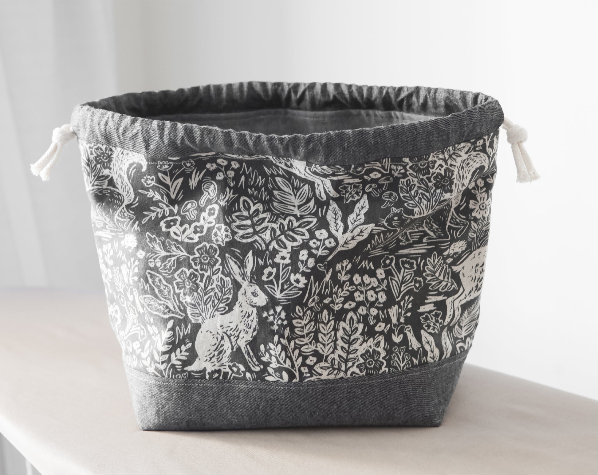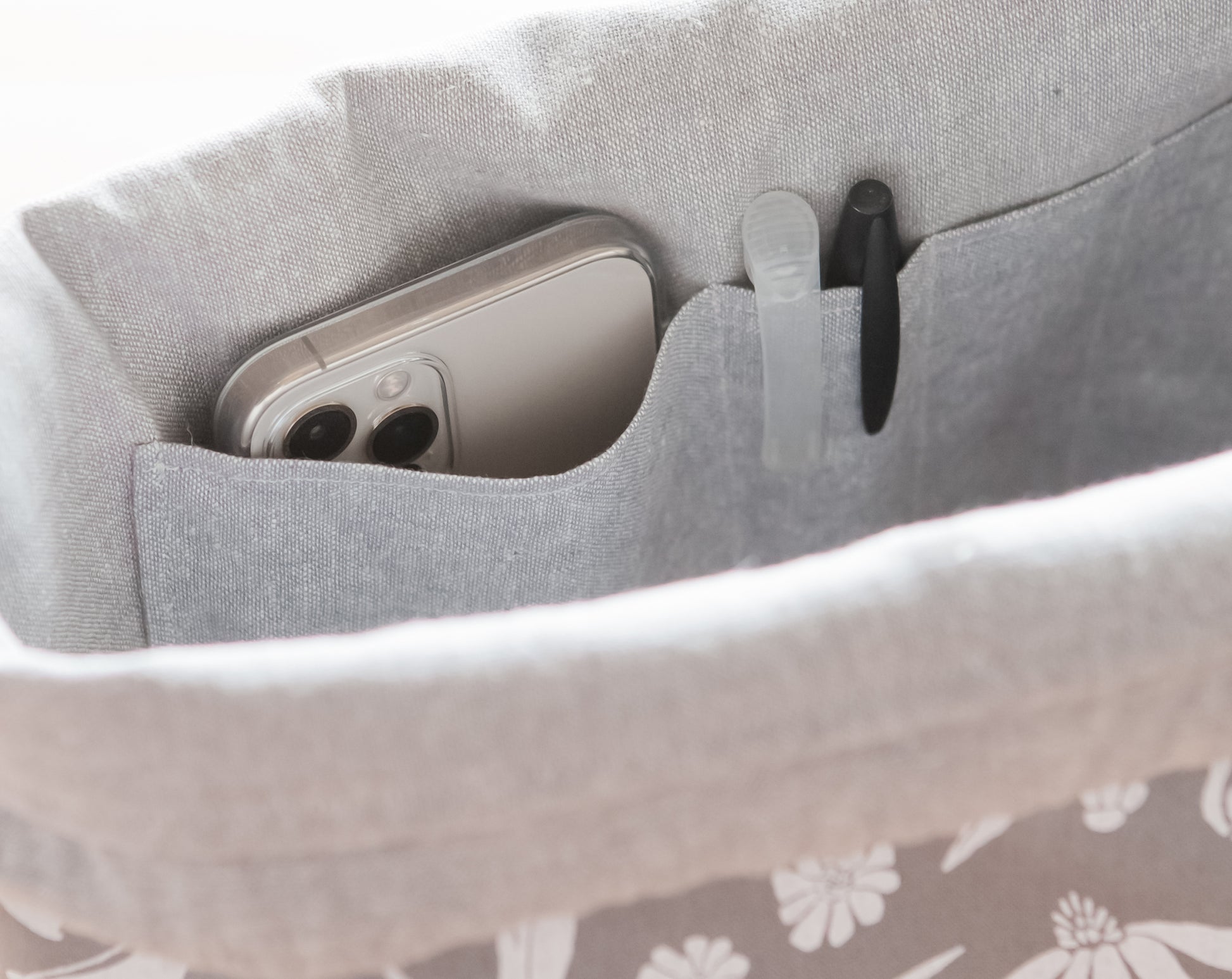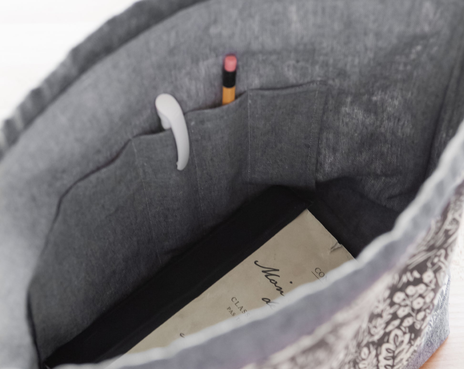 The design includes a channel at the top for the drawstrings and gussets at the bottom for a nice shape. And there are pockets! On one interior wall is a panel divided into one medium-sized pocket and three narrow pockets for needles, tools or writing implements. On the opposite interior wall is two medium-sized pockets perfect for your phone and/or small notebook.