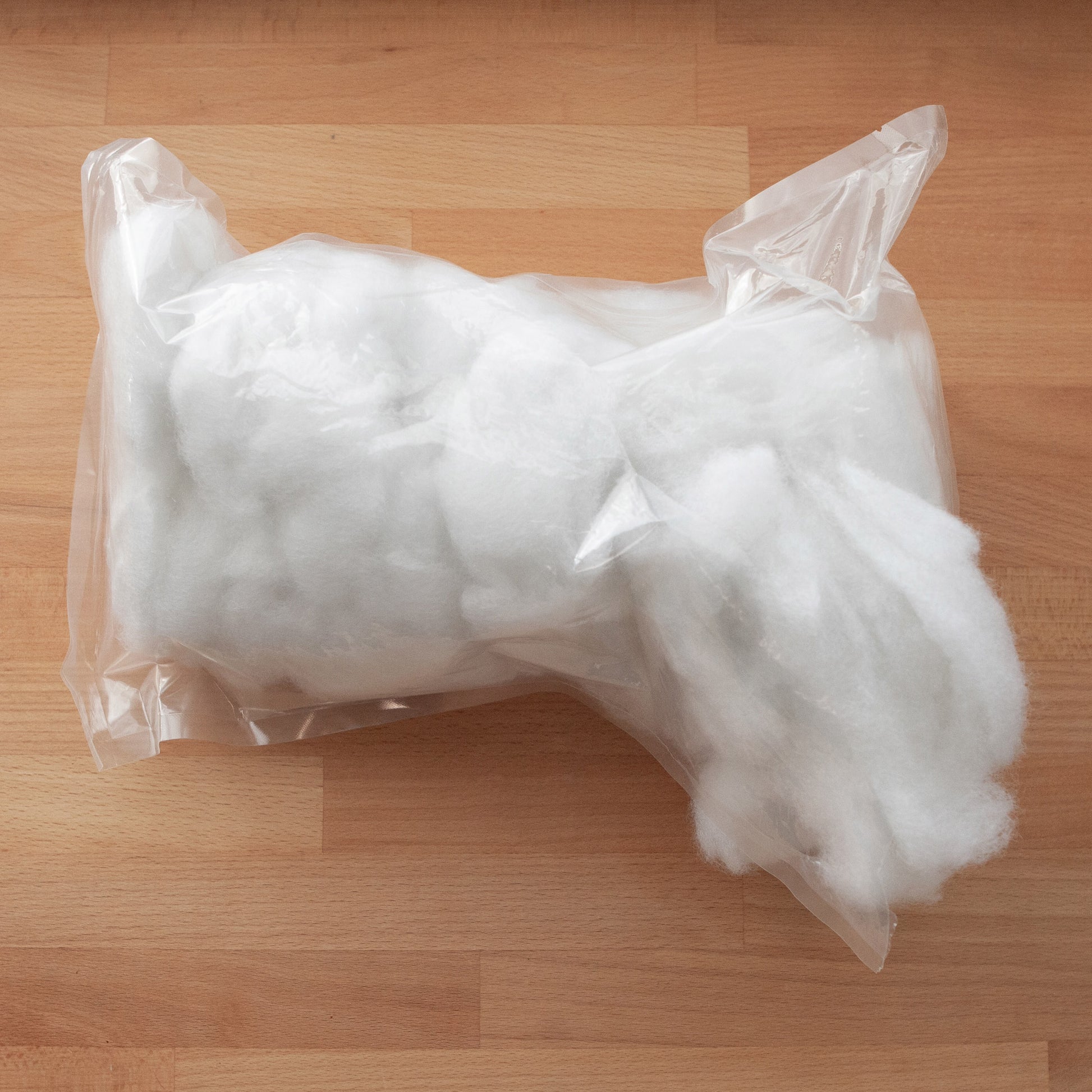 • Fiberfill. Packed in a vacuum-sealed package to save space during shipping. Simply open it before stuffing the toy, and it will expand back to its full size.